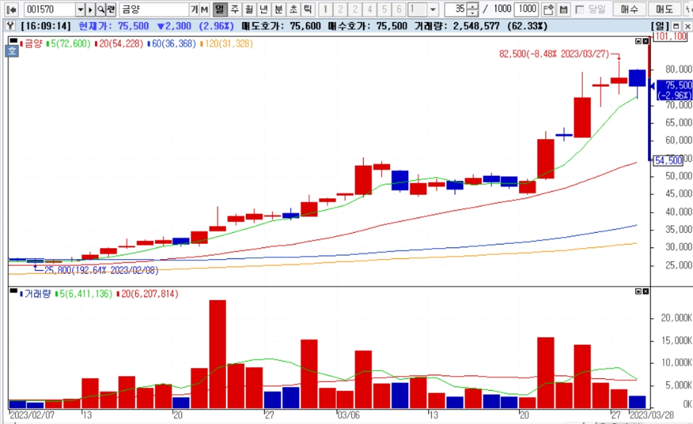 이미지 확대보기28일 한국거래소에 따르면 금양 주가는 전거래일 대비 2300원(2.96%) 하락한 7만5500원에 거래를 마감했다.