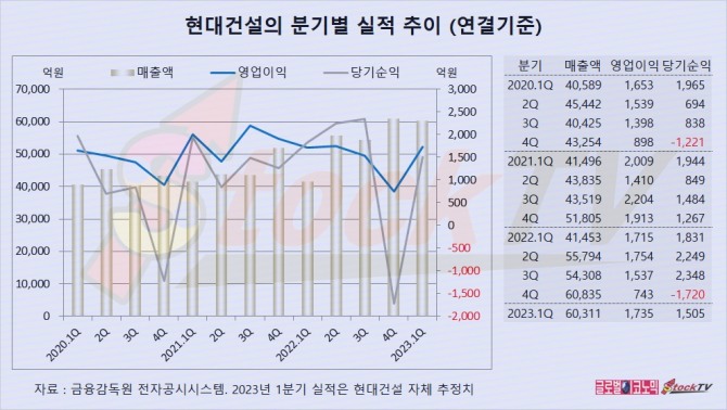 현대건설의 1분기 연결기준 영업이익은 1735억원으로 전년동기보다 1% 늘었지만 당기순이익은 1505억원으로 18% 줄었습니다.