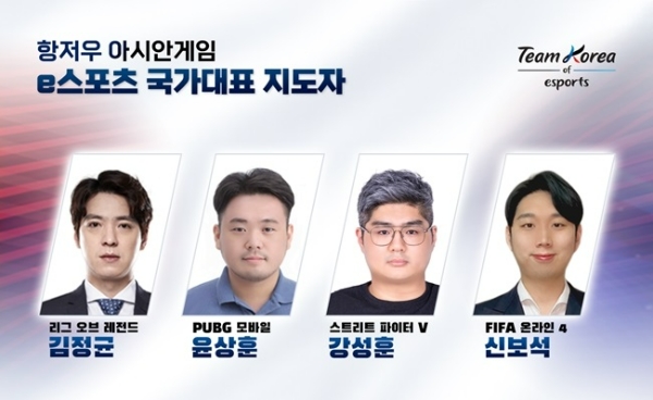 국가대표 감독은 지난해 선발됐던 LOL 종목 '꼬마' 김정균, 배그 모바일 '잔치' 윤상훈, 스트리트 파이터 5 '머더케이' 강성훈, '피파 온라이 4' 신보석 감독이 그대로 유임됐다. '서렌더' 김정수 감독은 하스스톤이 정식 종목에서 제외됨에 따라 목록에서 빠졌으며, 남은 3개 종목에선 국가대표를 파견하지 않는다.
