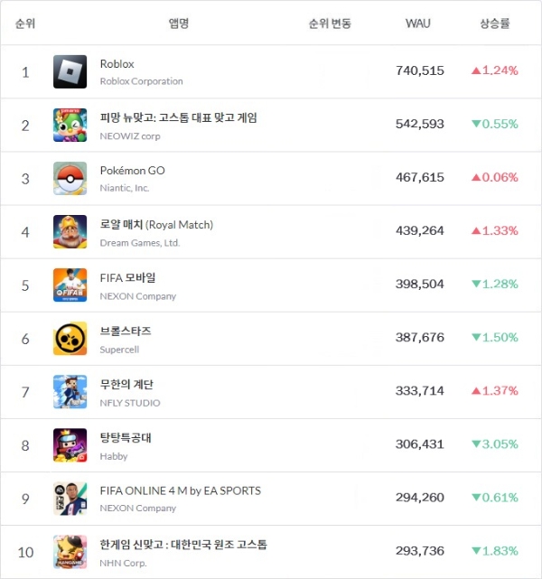 6월 2주차 WAU 톱10 게임 중 가장 높은 수익을 거둔 것은 매출 10위 넥슨 '피파 모바일'이었다. 그 외 '로블록스'가 13위, '탕탕특공대'가 20위, '피파 온라인 4M'이 21위, '로얄 매치'가 23위 등을 기록했다.