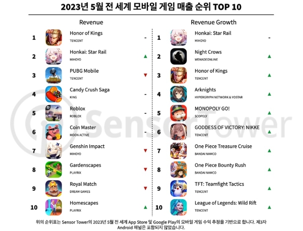 앱 통계 분석 플랫폼 센서타워가 발표한 5월 게임 매출 순위에 따르면 붕괴: 스타레일은 전월 10위에서 이달 2위로 순위가 상승했다. 같은 회사의 '원신'은 반대급부로 3위에서 7위, 크래프톤 '배틀그라운드(배그) 모바일'은 2위에서 3위로 순위가 조정됐다.