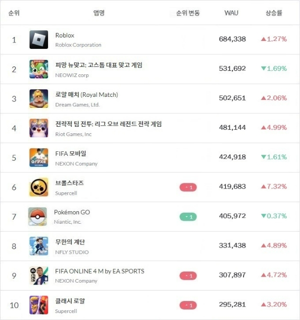 슈퍼셀 '브롤스타즈', '클래시 로얄'과 넥슨 '피파 온라인 4M' 등도 전주 대비 상승세를 보였다. 지난주 WAU 9위를 차지했던 NHN '한게임 신맞고'가 WAU 29만579명을 기록해 11위에 자리잡았다.