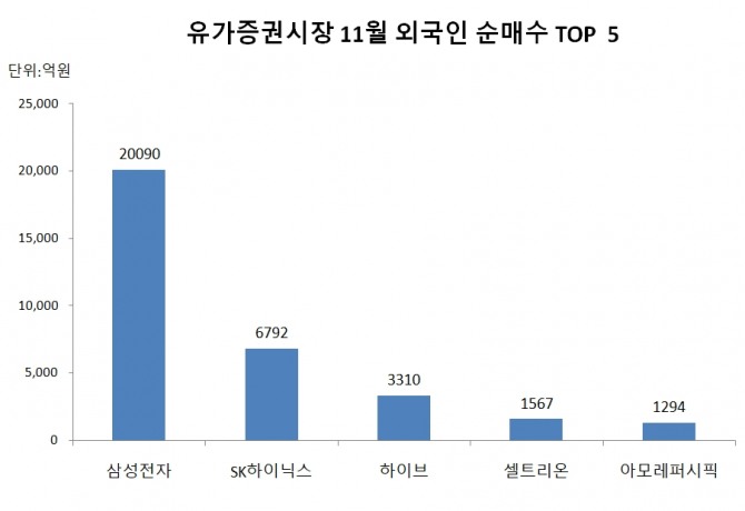 지난달 외국인이 가장 많이 사들인 종목은 삼성전자로, 순매수액은 2조90억원으로 집계됐다. SK하이닉스는 6천790억원으로 2위를 기록해 두 종목에서만 2조6880억원을 사들였다.