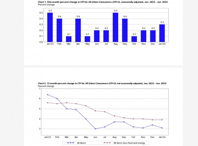 앞서 월스트리트 저널(WSJ)은 이코노미스트들을 대상으로 조사에서 2월 CPI는 전월에 비해 0.4% 올라 상승률이 지난 1월의 0.3%보다 확대됐을 것으로 관측했다. 연간 상승률은 지난 1월과 같은 3.1%를 유지했을 것으로 전망했다. 변동성이 큰 식품과 에너지를 제외한 근원 CPI는 지난 2월에 0.3% 올랐을 것으로 예상됐다. 이는 지난 1월의 전월비 상승률 0.4%보다 0.1%포인트 낮아진 것이다. 지난 2월 근원 CPI의 전년비 상승률은 3.7%로 지난 1월의 3.9%보다 둔화됐을 것으로 예측됐다.