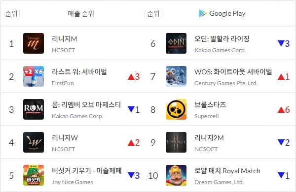 올 1월 21일 구글 매출 1위에 오른 후 2월 말까지 1, 2위를 오고가던 '버섯커 키우기'는 3월 들어 3~5위 사이를 오고가고 있다. 이 가운데 카카오게임즈 '오딘: 발할라 라이징', 엔씨소프트(NC) '리니지W' 등이 톱5에 오르내리고 있다.