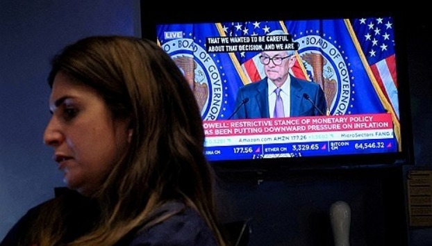 2024년 3월 20일 TV 화면에 제롬 파월 연방준비제도 의장의 기자회견이 내용이 나오는 가운데 뉴욕증권거래소에서 트레이더가 일하고 있다. 사진=로이터/연합뉴스