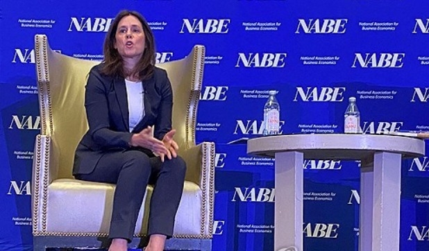 2023년 10월 9일 미국 텍사스주 댈러스에서 열린 미국 경제학 협회 콘퍼런스에서 로리 로건 댈러스 연방준비은행 총재가 발표하고 있다. 사진=로이터/연합뉴스