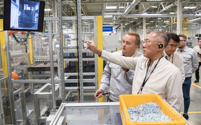 정의선 회장이 현대차 체코공장 내에 위치한 현대모비스 배터리시스템(BSA) 공장에서 현지 직원과 이야기를 나누고 있다. 사진=현대차그룹이미지 확대보기