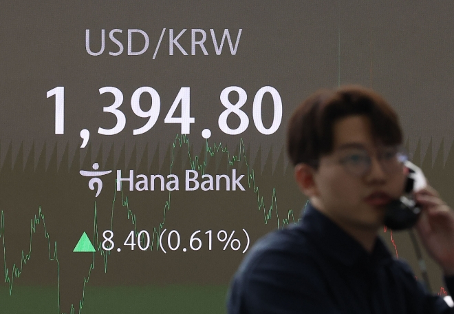 이미지 확대보기12일 서울외환시장에 따르면 원·달러 환율은 전장 서울 외환시장 주간 거래 종가(오후 3시30분) 1386.40원 대비 14.60원 오른 1401.00원에 마감했다. 종가가 1400원을 넘은 채 장을 마친 것은 지난 2022년 11월 7일 기록한 1401.2원 이후 처음이다.