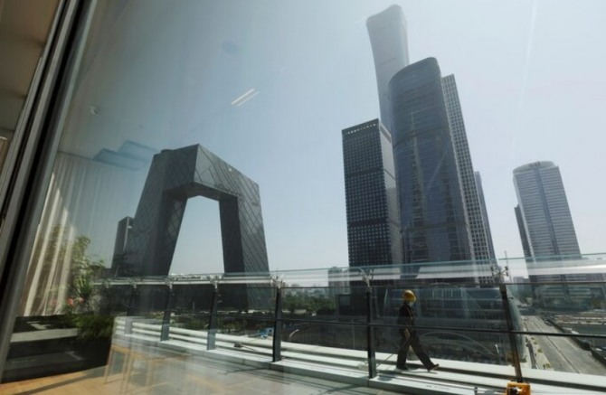 중국 베이징 중심업무지구(CBD)의 한 쇼핑몰에서 청소 노동자가 유리창을 통해 보이고 있다. 사진=로이터