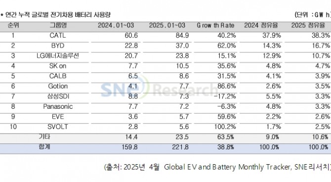업체별로 보면 LG에너지솔루션은 전년 동기 대비 15.1%(23.8GWh) 성장하며 3위를 유지했다. SK온은 35.6%(10.5GWh)의 성장률을 기록해 4위에 올랐다.