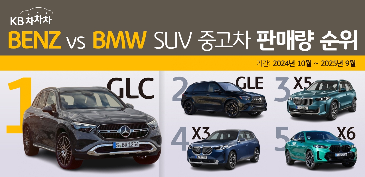 KB캐피탈이 운영하는 중고차 거래 플랫폼 ‘KB차차차’에서 지난 1년간 판매된 벤츠·BMW SUV 모델 중 가장 많이 팔린 차량은 벤츠 GLC-클래스로 나타났다. KB캐피탈은 2024년 10월부터 2025년 9월까지 1년간 KB차차차 거래 데이터를 분석한 결과, 벤츠 GLC-클래스가 판매량 1위를 기록했다고 30일 밝혔다.
