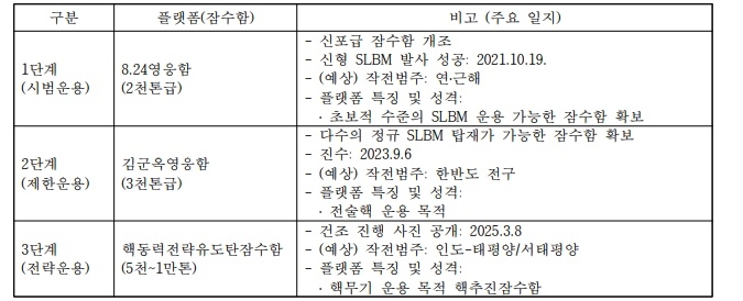 북한은 이미 2021년 1월 노동당 제8차 대회에서 전략핵잠수함(SSBN) 개발 의지를 천명하고,2023 년 9 월에는 전술핵무기 탑재가 가능한 디젤잠수함 '김군옥영웅함'을진수하면서 기존의 잠수함들도 모두 전술핵을 탑재하는 공격형잠수함들로 개조하려는 '저비용 첨단화 전략'을 공개했다. 이어 지난 3월 SSBN 선체(船體) 건조 장면을 공개하는 등 핵잠수함 개발에서 놀라울 정도로 빠른 속도를 보이고 있다고 정 수석연구위원은 평가했다.