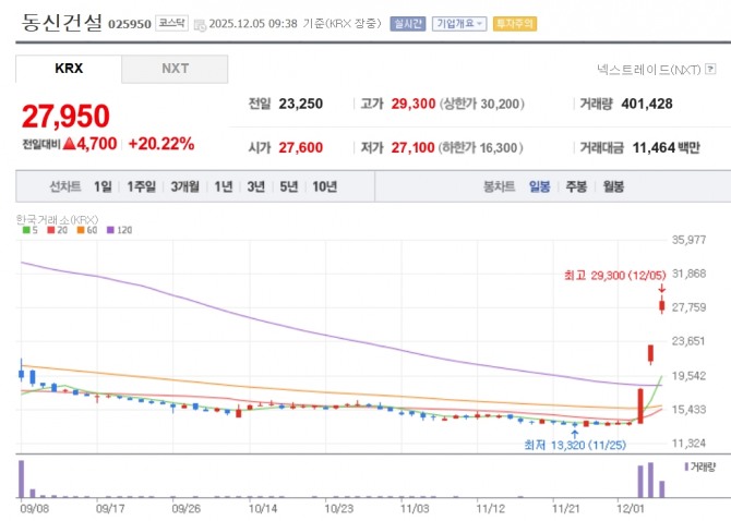 이미지 확대보기5일 한국거래소에 따르면 이날 오전 9시 38분 기준 동신건설은 전 거래일 대비 20.22% 증가한 2만 7950원에 거래되고 있다. 일성건설도 22.15%, 계룡건설 8.42%, KCC건설 6.95% 등이 일제히 상승세다.