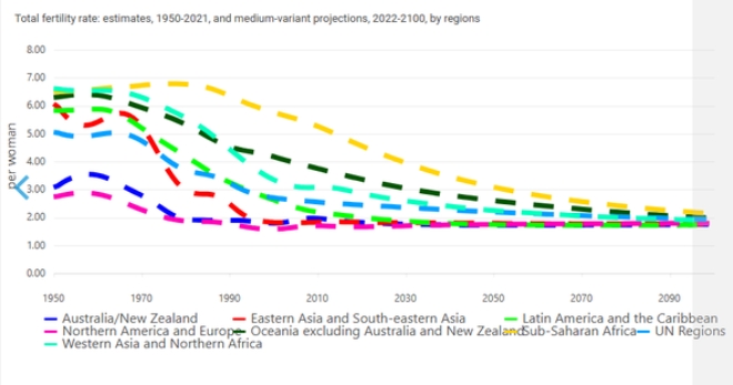 아프리카는 여전히 높은 출산율을 유지하고 있지만 감소 속도가 빨라지고 있고 동아시아는 이미 초저출산 국면에서 추가 하락이 이어지고 있다.