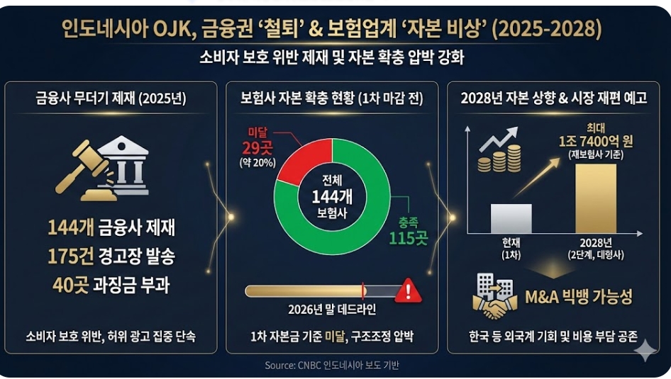 금융권 규제 강화의 불똥은 보험업계의 자본 확충 이슈로 옮겨붙었다. OJK가 제시한 강화된 자본 규제 시한이 다가오면서, 기준을 맞추지 못한 중소형 보험사들의 생존 경쟁이 치열해질 전망이다.