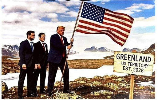 트럼프 대통령 옆에는 마코 루비오 국무부 장관과 JD 밴스 부통령이 서 있고, 사진 속 표지판에는 '그린란드 - 미국령 EST. 2026' 이라고 적혀있다.