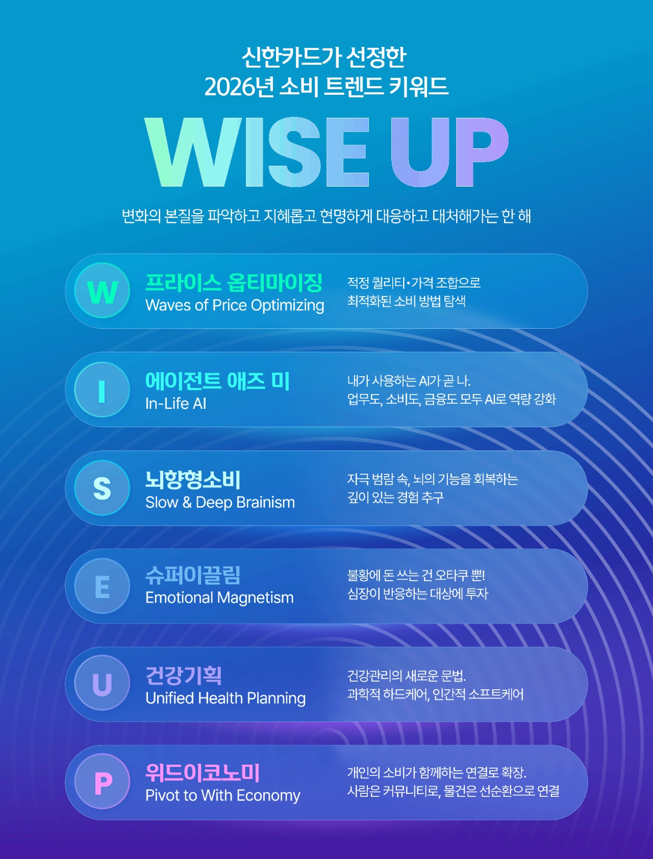 이미지 확대보기신한카드 빅데이터연구소는 ‘WISE UP’을 구성하는 6대 세부 키워드로 △프라이스 옵티마이징(W) △에이전트 애즈 미(I) △뇌향형 소비(S) △슈퍼 이끌림(E) △건강 기획(U) △위드 이코노미(P)를 제시했다.