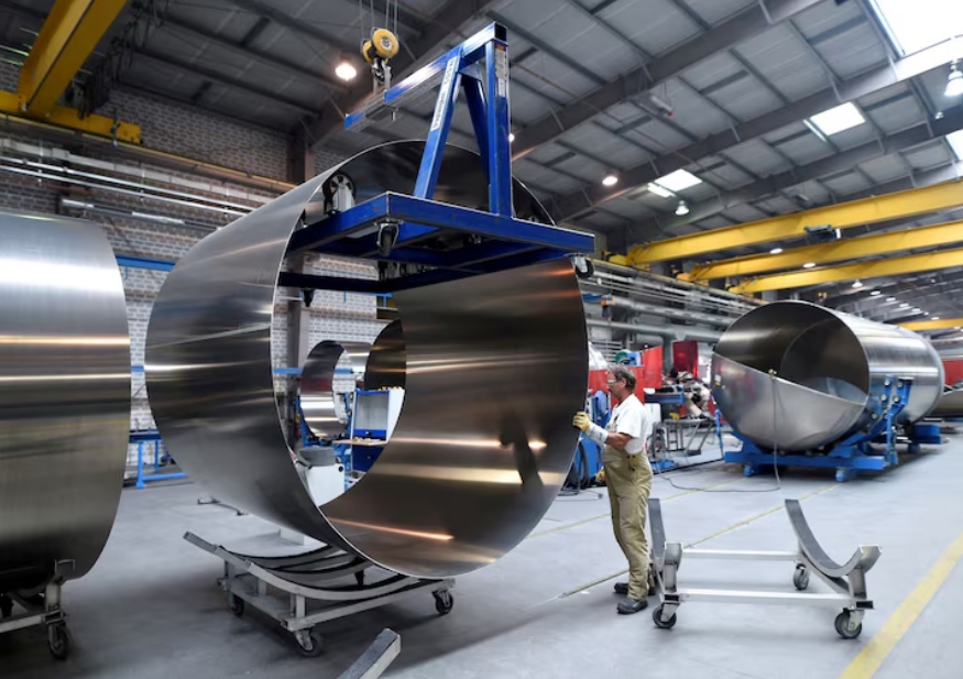 독일 사일로 및 액체 탱커 제조업체인 펠트빈더 스페셜 비히클스의 노동자가 독일 빈센에 위치한 공장에서 알루미늄 롤을 옮기고 있다. 사진=로이터이미지 확대보기