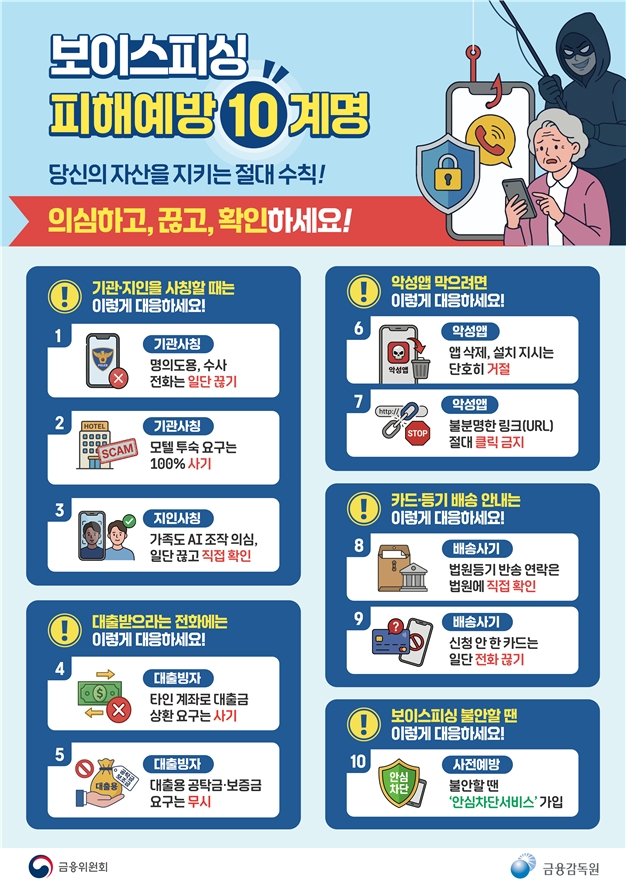15일 금융권에 따르면 금융감독원과 금융위원회는 지난 10일 설 명절을 앞두고 ‘보이스피싱 피해예방 10계명’을 발표하며 보이스피싱 예방에 나섰다.