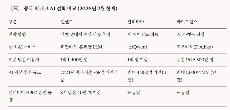 중국 빅테크 AI 전략 비교 (2026년 2월 현재). 도표=글로벌이코노믹