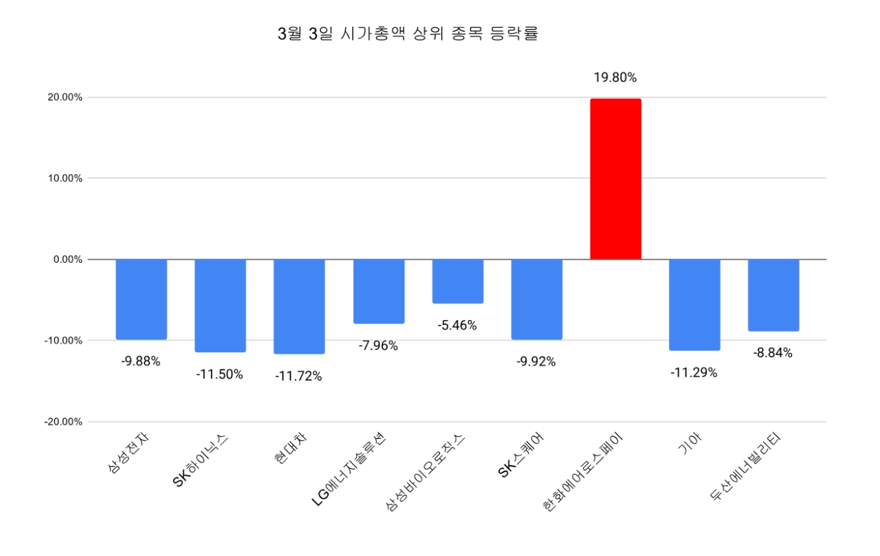 3일 한국거래소에 따르면 코스피는 전 거래일 대비 7.24%(452.22포인트) 폭락한 5791.91에 장을 마쳤다. 이는 종가 기준 역대 최대 하락 폭이다. 코스닥 역시 4.62% 내린 1137.70으로 밀려나며 양 시장 모두 충격을 피해 가지 못했다.