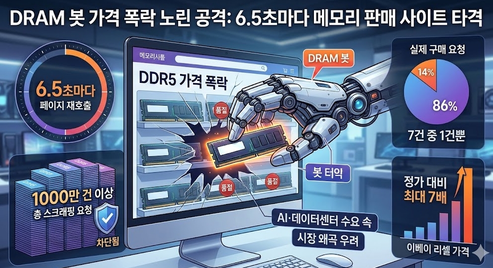 이미지 확대보기프랑스 사이버 보안 기업 데이터돔(DataDome)이 4일(현지시각) IT 전문 매체 톰스하드웨어(Tom's Hardware)를 통해 공개한 분석 보고서는 그 배후를 구체적 수치로 들춰냈다. DDR5 RAM 판매 사이트를 겨냥한 대형 스캐퍼 봇(Scalper Bot·자동 사재기 프로그램)이 1000만 건 이상의 웹 스크래핑을 실행한 사실이 확인됐다. 이 봇은 6.5초 간격으로 상품 페이지를 재호출하며 한 페이지당 550회 이상 집요하게 가격 정보를 수집했다. 사이트를 오가는 트래픽 7건 중 실제 구매 의사가 있는 접속은 1건에 불과했다.