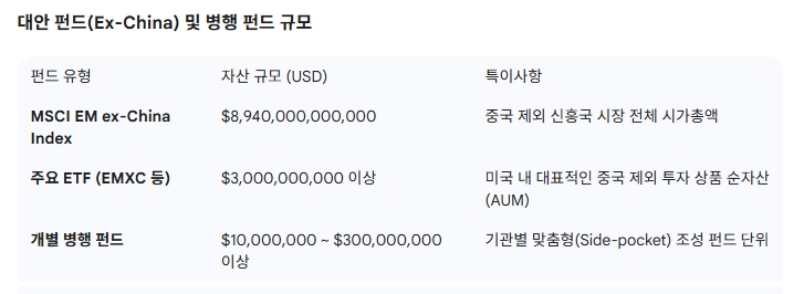자산운용사들은 현실적 대안으로 '병행 펀드' 구조를 택하고 있다. 하나의 운용 전략 아래 두 개의 펀드를 동시에 운영하는 방식이다. 하나는 아시아 전역을 대상으로 하는 기존 펀드이고, 나머지 하나는 중국을 제외한 아시아 지역에만 투자하는 '엑스-차이나(Ex-China)' 펀드다.
