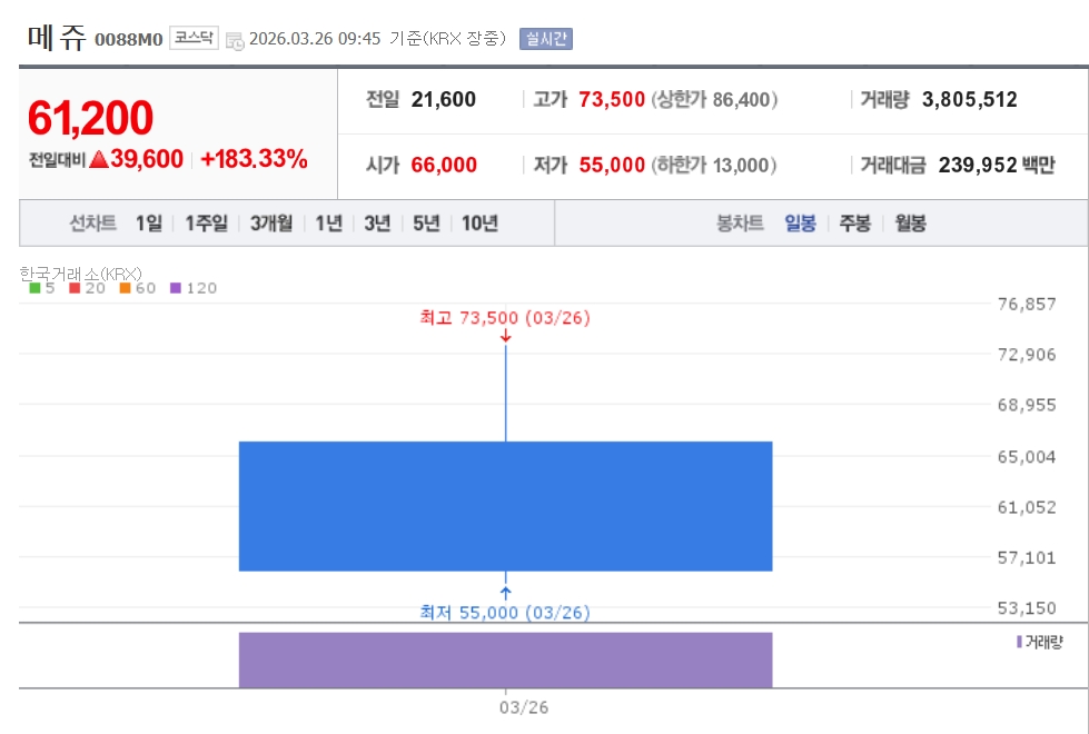 이미지 확대보기26일 한국거래소에 따르면 이날 오전 9시45분 현재 메쥬는 공모가(2만1600원) 대비 183.33% 오른 6만1200원에 거래 중이다. 이날 공모가보다 205.56% 오른 6만6000원에 시초가를 형성해 강세를 이어가고 있다.