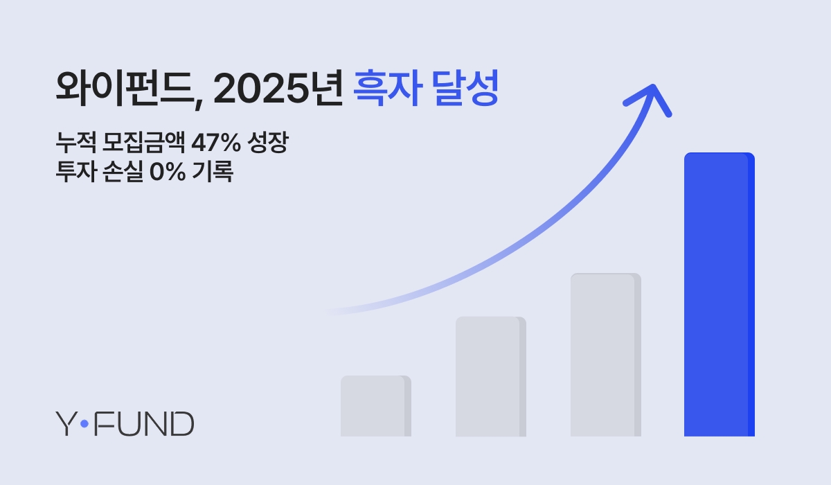 이미지 확대보기와이펀드는 2025년 회계결산 기준 흑자를 달성했다고 25일 밝혔다. 누적 모집금액은 전년 대비 47% 증가했고, 투자 잔액도 50% 이상 확대되는 등 플랫폼 성장세가 이어졌다. 약 20억원 규모 고액 대출 상품이 단기간 내 펀딩되는 등 투자 수요도 확대된 것으로 나타났다.