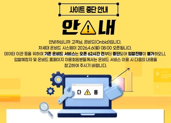 한편 캠코는 안정적인 시스템 전환을 위해 4월 2일 18:00부터, 4월 6일 08:00까지 총 62시간 동안 온비드 서비스를 일시 중단할 예정이다. 중단 기간에는 입찰 공고 조회, 입찰서 제출, 개찰 등 온비드의 모든 서비스 이용이 제한된다.