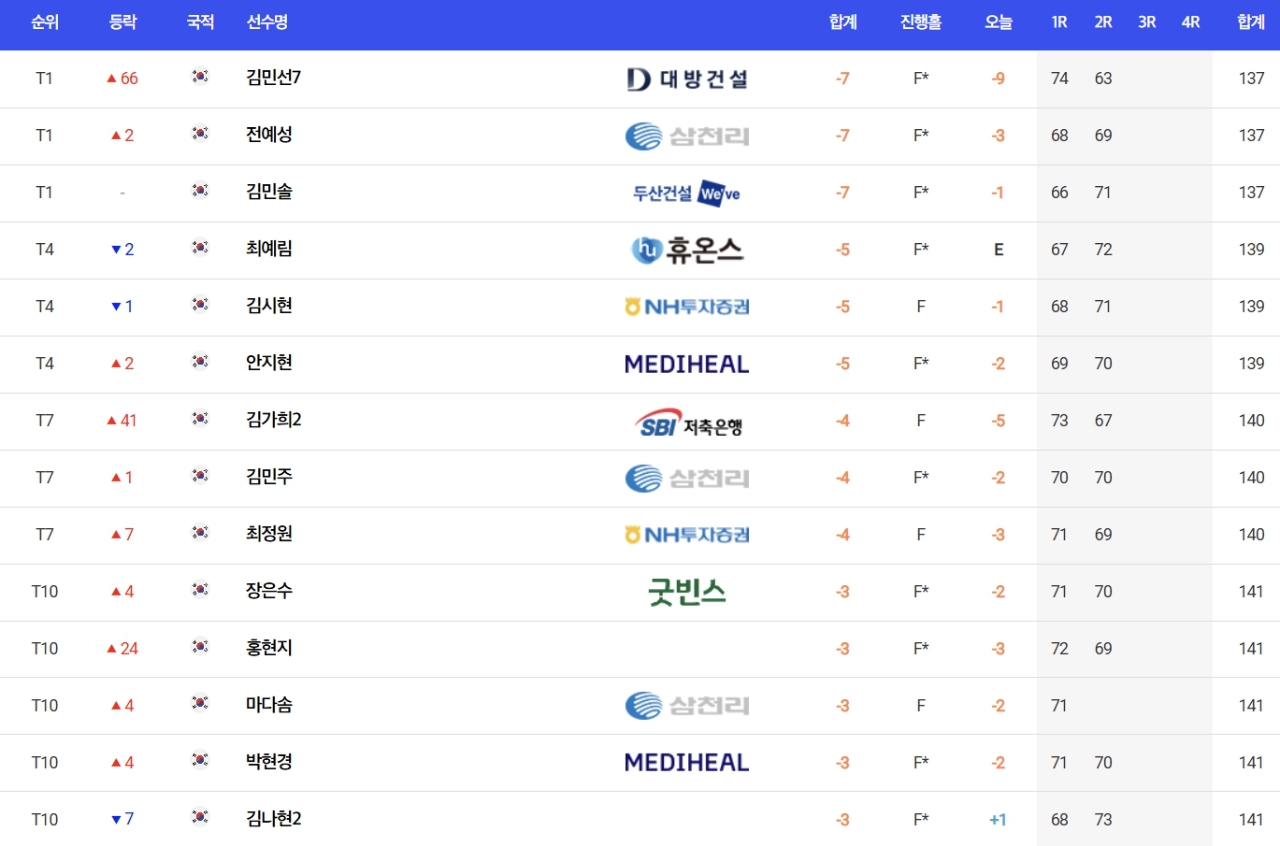 이미지 확대보기첫날 공동 67위로 컷 탈락 위기에 몰렸던 김민선7은 무려 9타를 몰아쳐 코스레코드를 갈아치우며 공동 선두로 껑충 뛰었다.
