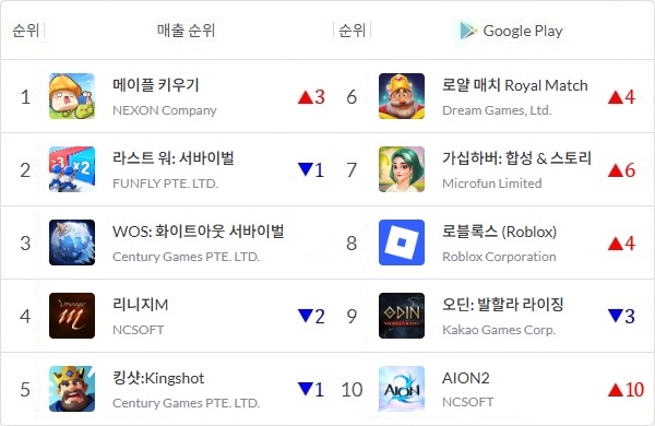 메이플 키우기와 라스트 워 외에도 '가십하버'와 '로블록스', '아이온 2' 등이 이번 주 새롭게 매출 톱10에 올랐다. 지난주 매출 7위 '트릭컬 리바이브'와 8위 '한게임포커 클래식', 9위 '마비노기 모바일'은 각각 11위와 15위, 18위로 자리를 옮겼으며 12위는 '라스트 Z', 13위는 '운빨존많겜', 14위는 '승리의 여신: 니케'가 차지했다.