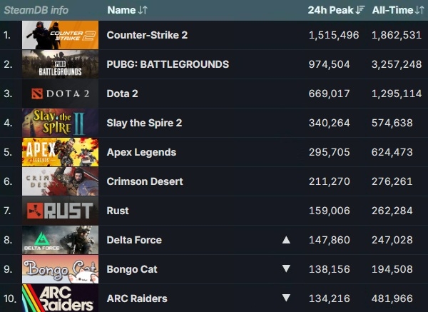 스팀 운영사 밸브 코퍼레이션의 '카운터 스트라이크 2'와 크래프톤의 '펍지: 배틀그라운드'부터 펄어비스의 '붉은사막'까지 동시 접속 톱6는 제 자리를 지켰다. 이중 '붉은사막'은 출시 직후부터 최근까지 4주 연속 주간 최다 동시 접속 20만 명을 유지하고 있다. 이 외에도 넥슨 산하 엠바크 스튜디오의 '아크 레이더스'는 8위에서 10위로 순위가 소폭 하락했다.
