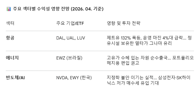 가장 견고한 흐름을 보이는 곳은 테크 및 AI 섹터다. 엔비디아(NVDA), 마이크로소프트(MSFT) 등은 지정학적 불안보다 압도적인 AI 수요라는 본질적 성장에 집중하고 있다. 특히 한국의 삼성전자와 SK하이닉스를 담은 EWY(한국 ETF)는 중동 리스크로 인한 일시적 조정에도 불구하고, 메모리 반도체 업황 회복과 저평가 매력이 부각되며 '안보 랠리'의 핵심축으로 주목받고 있다.