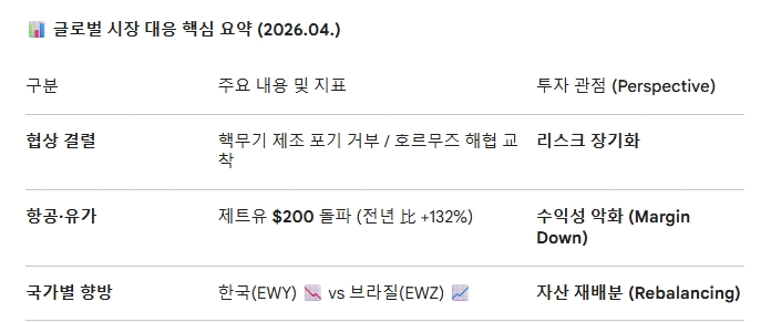 반면 에너지 섹터에서는 브라질(EWZ)과 같은 순수출국이 리스크 헤지 수단으로 부상했다. 고유가 환경이 오히려 국가 재정과 기업 이익에 호재로 작용하기 때문이다.
