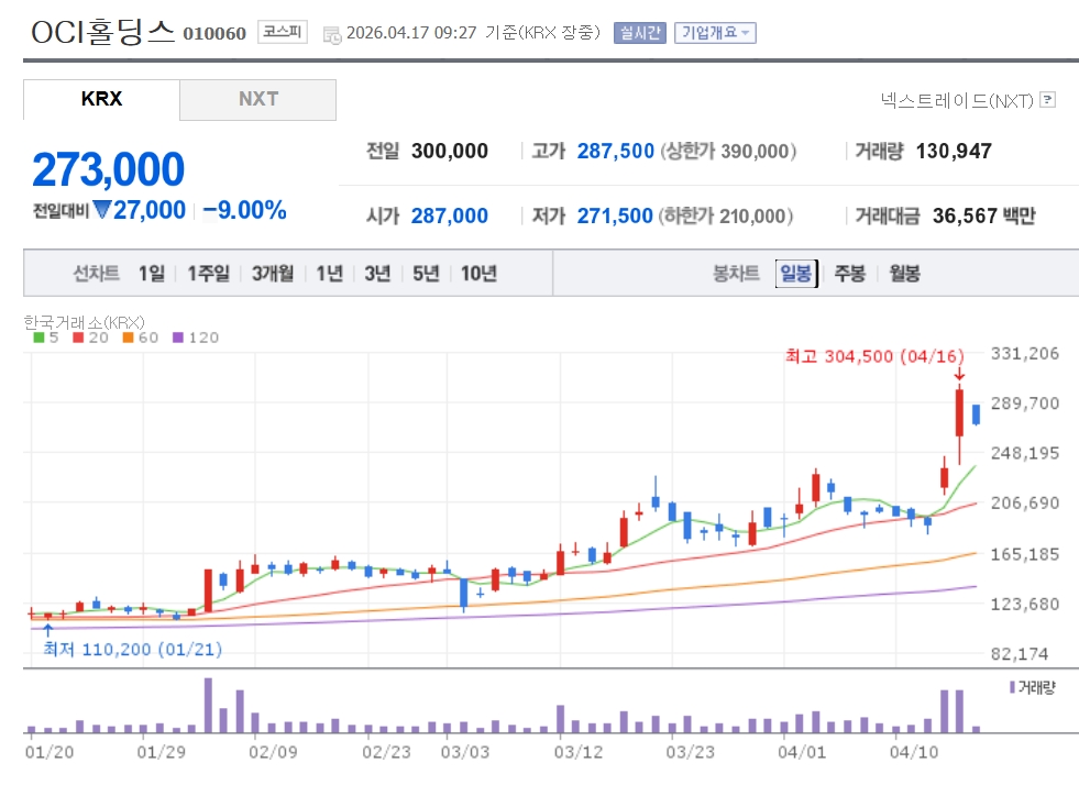 이미지 확대보기OCI홀딩스는 지난 15일 스페이스X에 태양광 및 반도체용 핵심 소재를 공급한다는 소식이 시장에 전해지며 가격제한폭(30.00%)까지 치솟아 상한가를 기록한 바 있다.