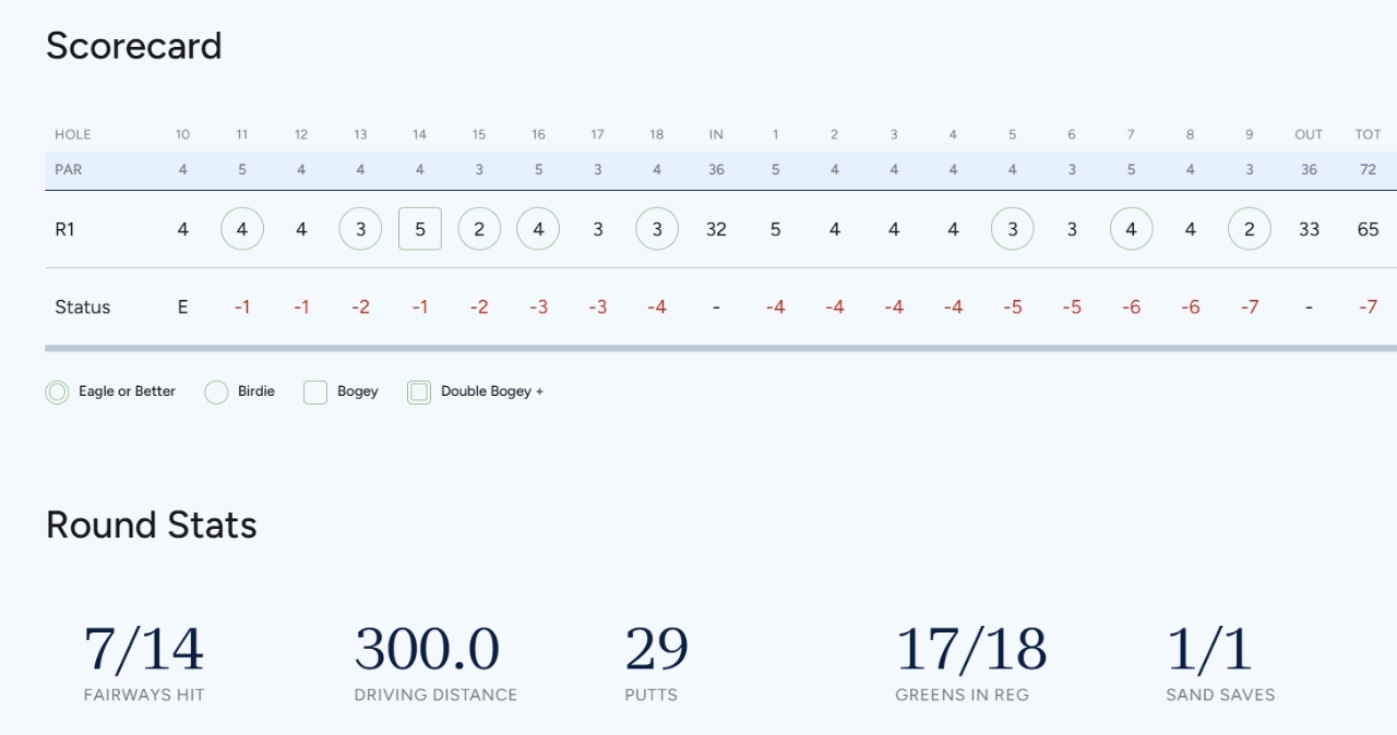 김세영은 드라이브 거리 300야드, 페어웨이 안착률 50%(7/14), 그린적중률 94.44%(17/18), 샌드세이브 100%(1/1), 퍼트수 29개를 기록했다.