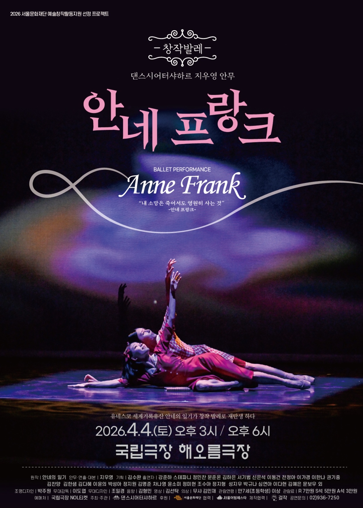 이미지 확대보기4월 4일(토) 오후 3시·6시, 국립극장 해오름극장에서 댄스시어터샤하르(예술감독 지우영) 주최·주관, 서울문화재단 후원, 서울어텀페스타 협력, 지우영 안무·연출·대본으로 2026 서울문화재단 예술창작활동지원 선정 프로젝트 '안네 프랑크'(Anne Frank)가 2회 공연되었다. 지우영은 전 작품을 창작 발레화 하여 애국발레 안무가의 전형이 되었다. 안네 프랑크의 삶은 인류와 인간성에 대한 중심 주제가 되어왔다. 발레 '안네 프랑크'는 나치 집단에 의해 저질러진 인간성 상실을 노련하게 침착하게 보여주었다. 이 작품은 지난해 시월 노원문화예술회관에서 두 차례 공연된 바 있다.