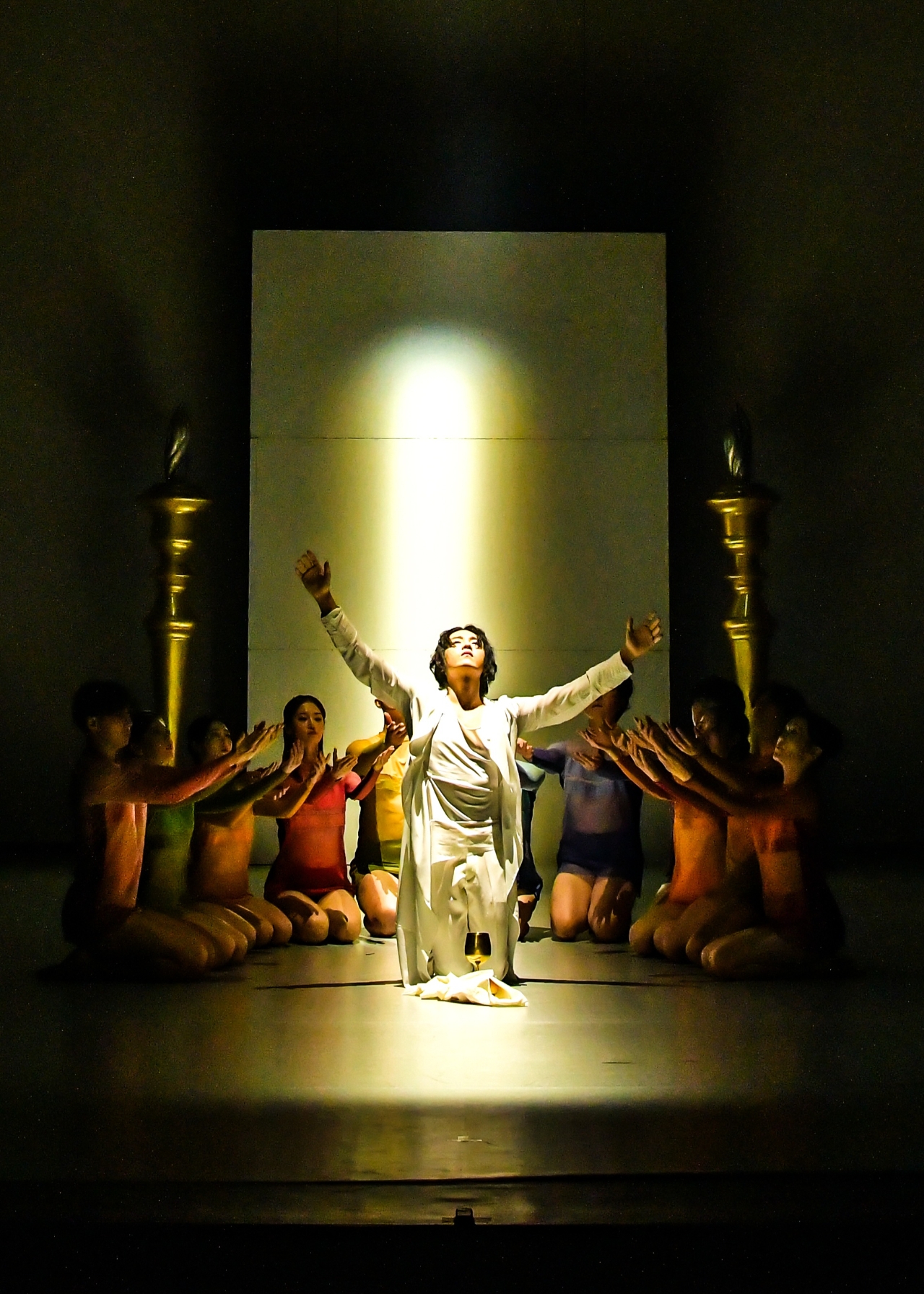 이미지 확대보기지우영의 작품은 휴머니즘을 강조하면서 군인들이 많이 쓰인다. 발레 '안네 프랑크'도 객석을 훑는 게슈타포들의 손전등 수색에서 시작된다. 군복을 입은 그들이 등장하면서 공포감을 배가시키는 군무가 펼쳐진다. 독일어로 흐르는 음성들이 섬뜩한 분위기를 조성한다. 안네의 가족은 독일 중부에서 네덜란드 암스테르담의 비밀창고로 피신한다. 식자재 공장 사무실 창고를 책장으로 위장한 가족의 생활 공간은 비좁고 불편하다. 안네는 솔로로 동화적 명랑함을 연기해 낸다. 스크린에 안네의 일기가 투사된다. 안무가는 안네의 일기에 나오는 가상의 친구 '키티'를 무대에 세운다.