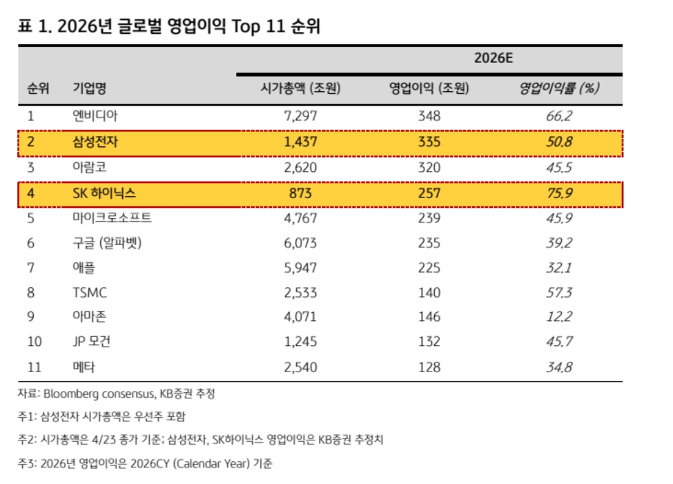 아울러 “빅테크와 3~5년 장기공급계약 확대는 2030년까지 메모리 공급 부족 장기화를 시사하며, 향후 메모리 사업은 TSMC식 파운드리형 비즈니스로 진화해 실적과 밸류에이션 확장기에 진입할 전망”이라며 “SK하이닉스는 2026년 257조원, 2027년 394조원의 영업이익을 달성하며 글로벌 영업이익 상위 3위권에 진입할 것으로 예상된다”고 내다봤다.