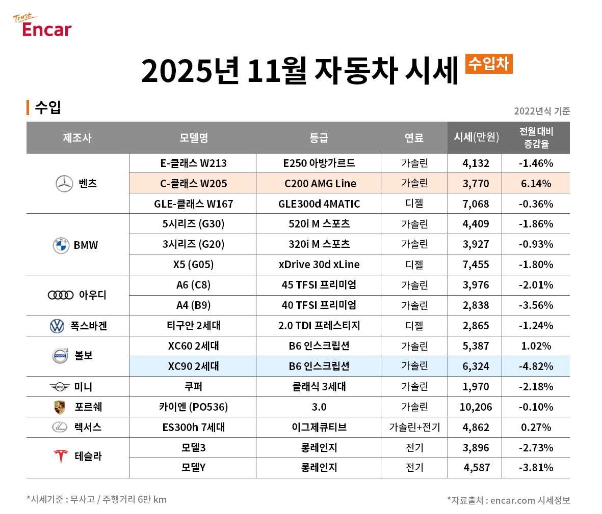 볼보 XC90 2세대 B6 인스크립션은 4.82% 하락하며 11월 수입차 중 가장 큰 하락폭을 보였다. 아우디의 세단 모델인 A4 (B9) 40 TFSI 프리미엄과 A6 (C8) 45 TFSI 프리미엄은 각각 3.56%, 2.01% 시세가 하락했다.