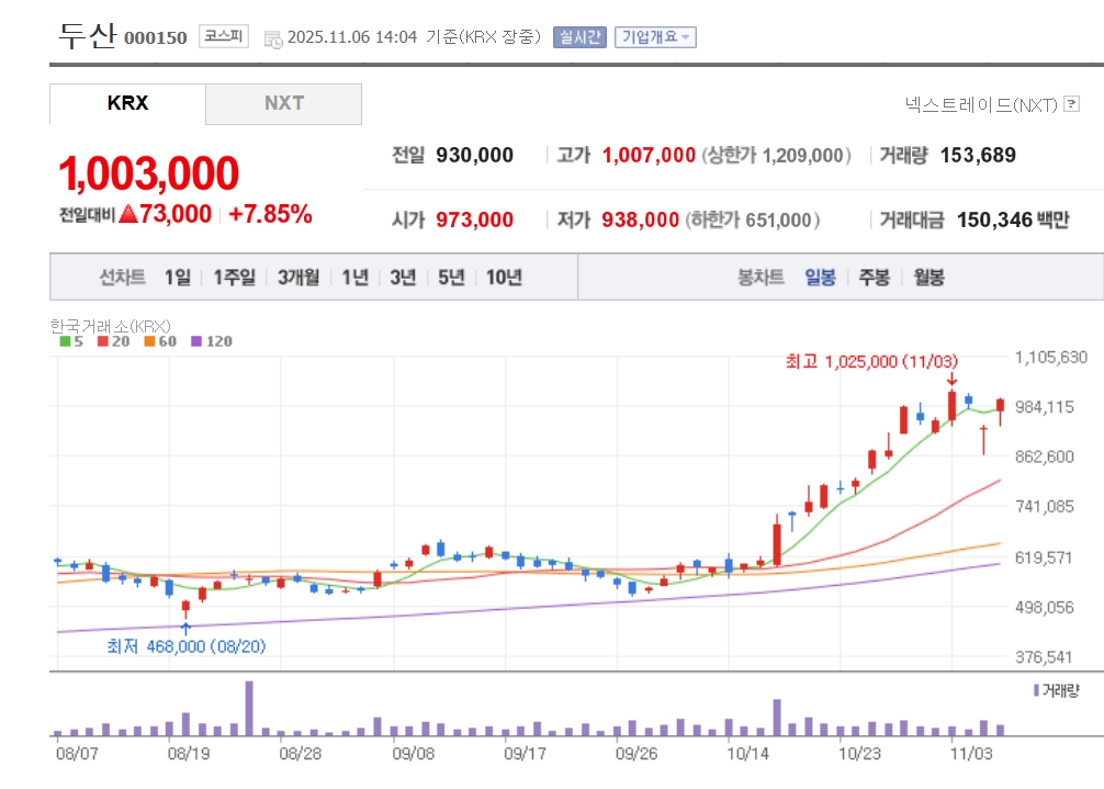 이미지 확대보기6일 한국거래소에 따르면 오후 14시04분 두산은 전날에 비해 7.85% 급등한 100만3000원에 거래되고 있다. 지난 3일 102만5000원을 터치하면서 52주 신고가를 경신했다. 그 이후로 하락세를 보이다 이날 급등하면서 황제주 자리를 다시 꿰찰 모양새다.