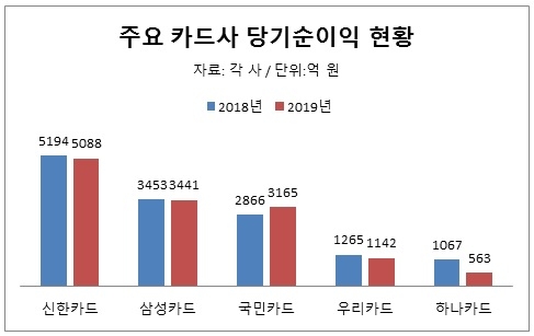 하나카드 관계자는 “가맹점수수료 인하 영향과 일회성비용으로 나간 게 없었다면 지난해 순이익이 1350억 원 정도로 2018년 1265억 원보다 더 됐을 것”이라면서 “또 대형사에 비해 마케팅비용을 줄일 수 있는 여력이 적어 신규 회원 유치가 어려운 영향도 있었다”고 설명했다.