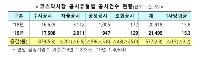 지난해 코스닥시장 상장법인의 전체 공시 건수는 2만1495건으로 전년의 2만918건보다 2.8% 증가했다.