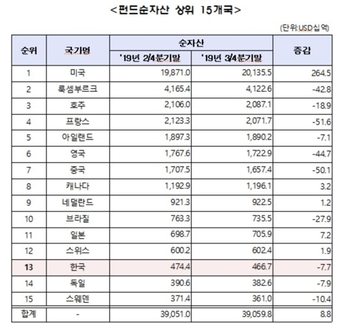 반면 프랑스는 516억 달러, 중국 501억 달러, 영국 447억 달러 등 10개국은 펀드 순자산이 감소했다.