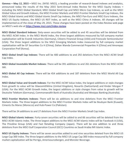 announced today the results of the May 2015 Semi‐Annual Index Review for the MSCI Equity Indexes –