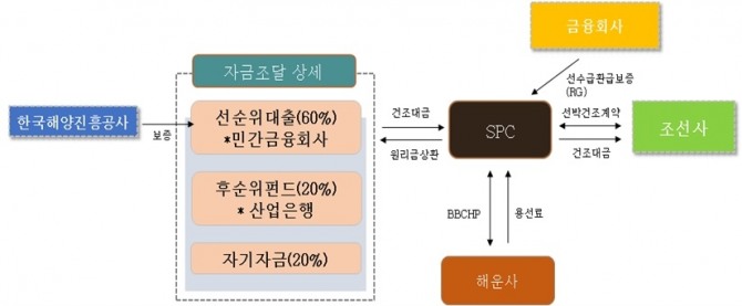 신조 대금의 60%를 민간금융회사를 통해 선순위로 조달하고 해양진흥공사가 자금의 95% 이상을 보증 지원한다. 후순위로 산업은행이 신조대금의 20%를 지원하고 나머지 20%는 해운사가 자체 부담한다.