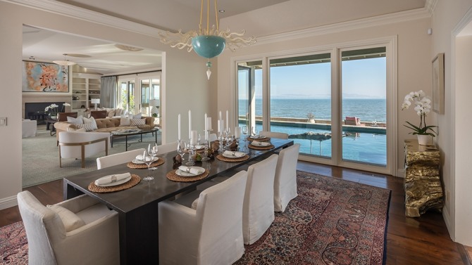 이 저택은 대문이나 시야를 가리는 높은 울타리가 없는 거리에 위치한다. 6500평방피트(약 182평)가 넘는 이 건물에는 6개의 침실과 6.5개의 욕실이 있다. 벽난로가 있는 아늑한 성당식 천장 거실은 바닥부터 천장까지 미닫이 유리문이 있는 벽을 통해 만을 가로지르는 전망이 장관이다.