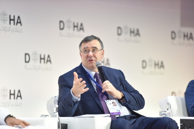 파트리끄 뿌얀 토탈 CEO이 도하포럼에서 연설하고 있다. 사진=파트리크 푸야네 CEO 트위터이미지 확대보기